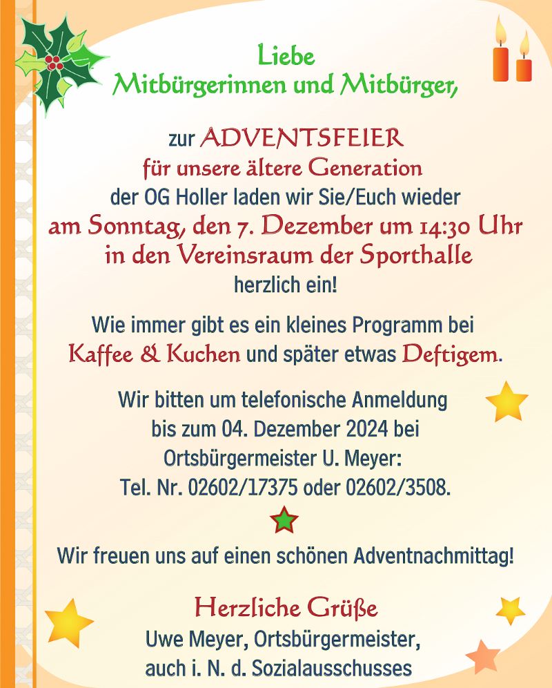 zur ADVENTSFEIER für unsere ältere Generation der OG Holler laden wir Sie/Euch wieder